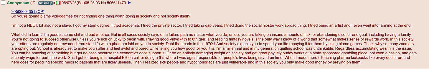 I suppose I could have seen this anywhere but Shinichi Haku restacked one of my notes with this image and it sort of clicked. It clicked that there is no gratitude, there is no reward, there is no purpose to things you do anymore. Nihilism is built into the system as a primary function.